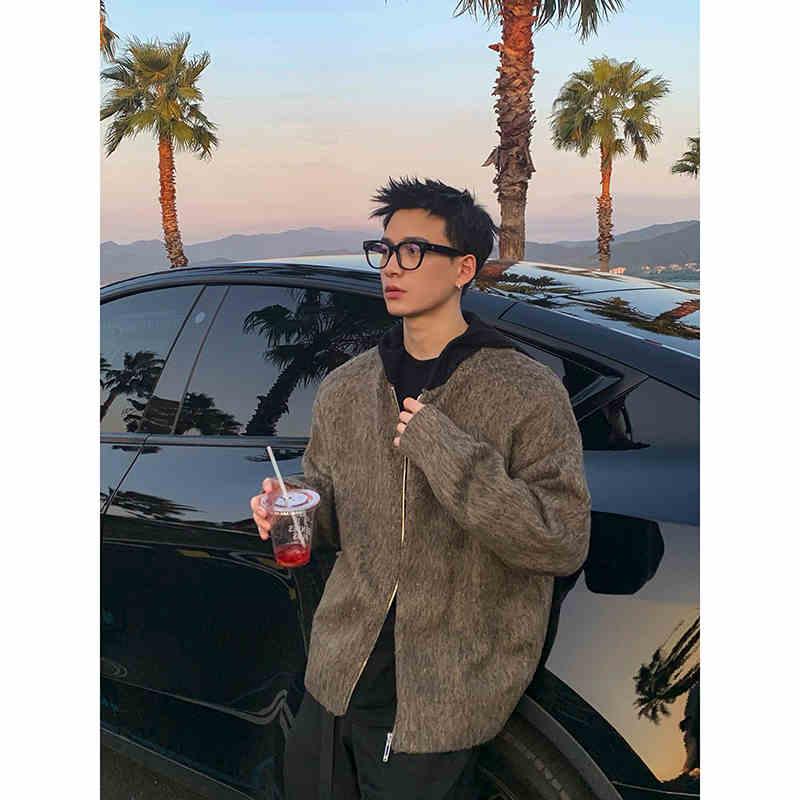 PLTH美式复古宽松开衫毛衣男女海马毛外套设计感撞色连帽针织衫