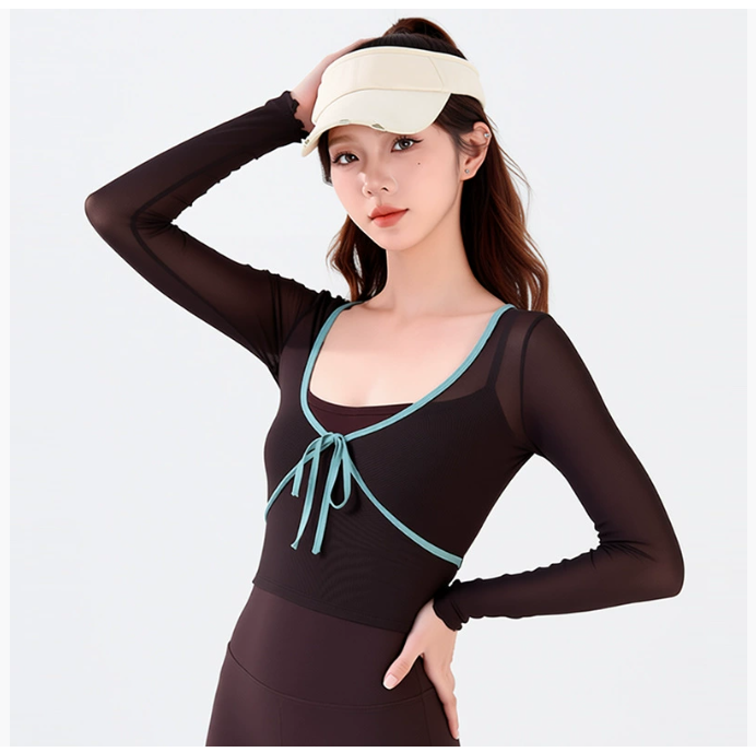跨境性感网纱圆领上衣裸感速干透气健身长袖瑜伽服跑步运动健身服