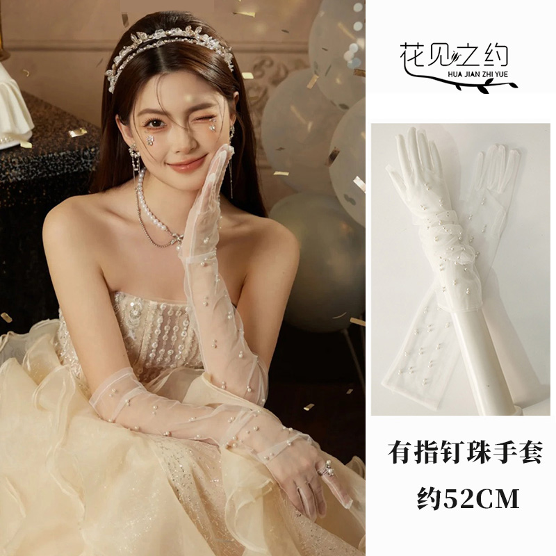新娘手套网纱白色长版珍珠手袖包指旅拍防晒薄纱手袖婚纱舞台套袖