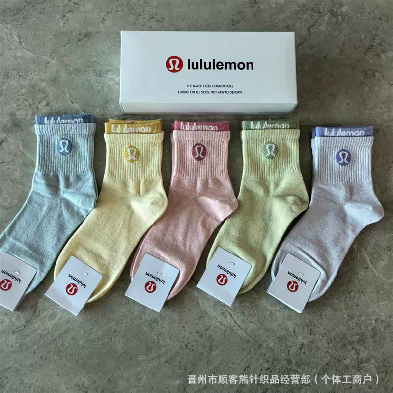 外贸袜子LULU中筒棉袜盒装5双装字母潮袜吸汗透气条纹黑白色潮牌