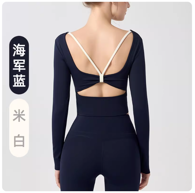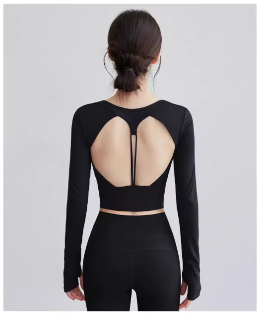 秋冬新款运动瑜伽带垫露背长袖修身显瘦普拉提速干跑步健身上衣