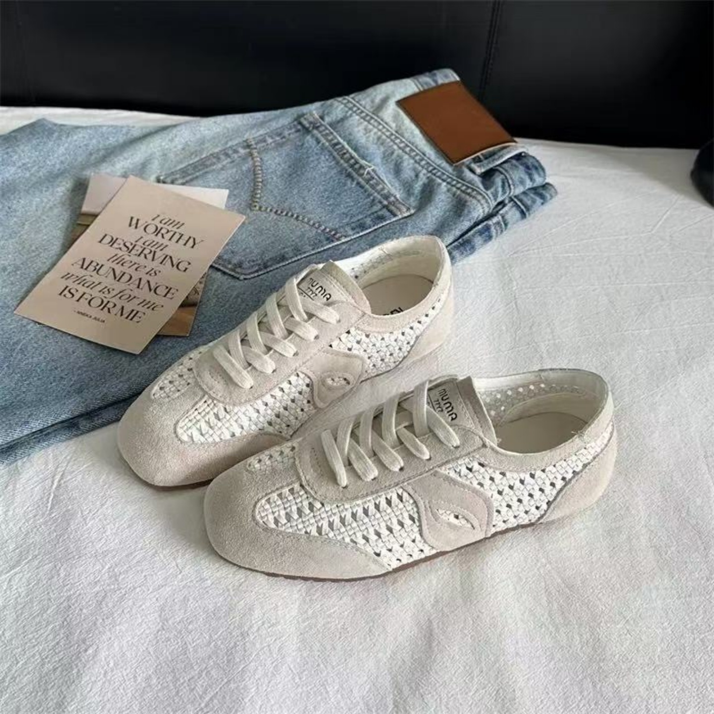 2025夏季新款网面透气软底百搭阿甘鞋女复古真皮休闲运动德训鞋