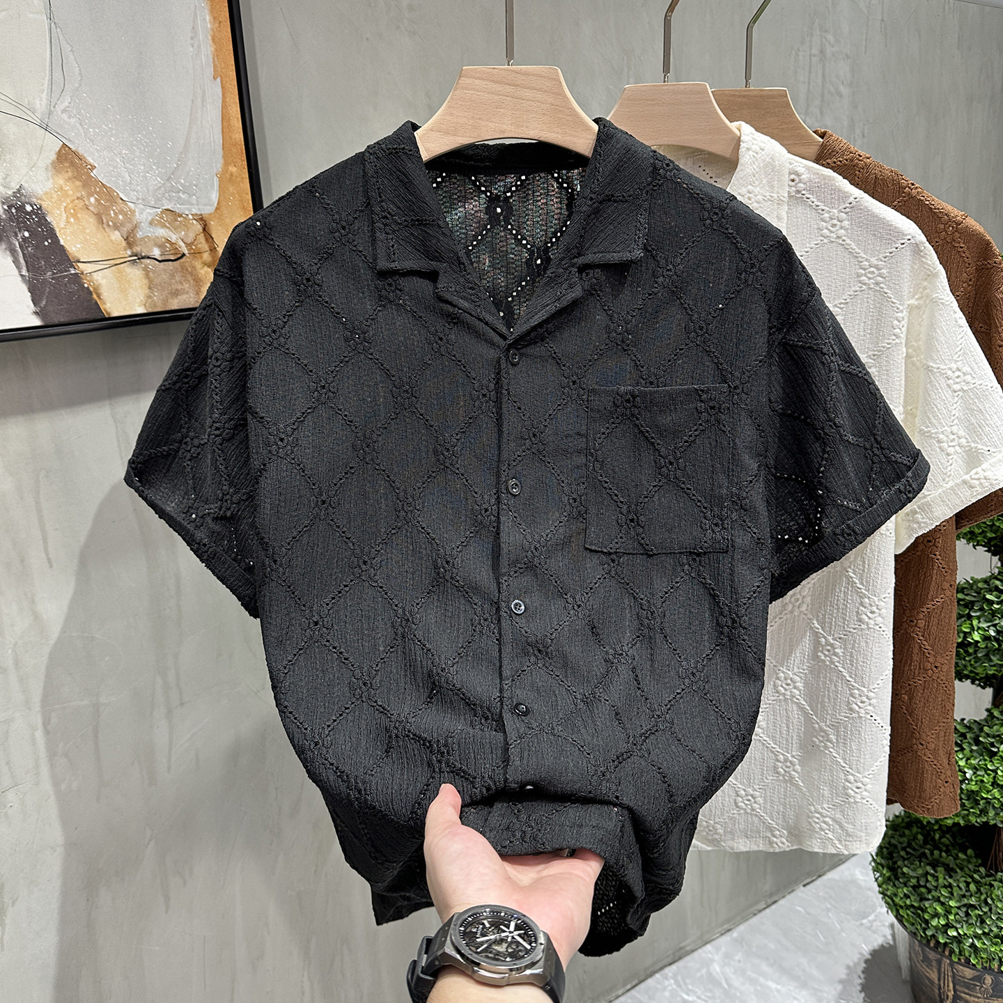 古巴领镂空复古高级感短袖衬衫男款夏季高街痞帅衬衣设计感半袖
