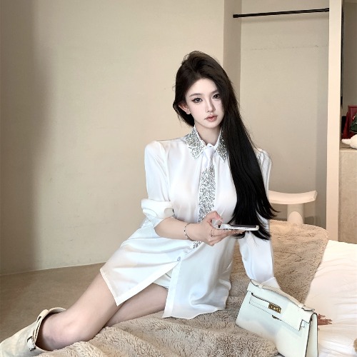 秋冬高贵洋气名媛御姐风重工水钻缎面宽松衬衫配领带长袖T恤上衣