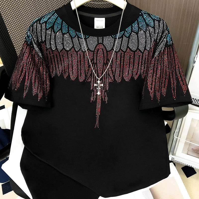 美式大码300斤复古重工翅膀烫钻短袖T恤男女宽松情侣休闲百搭上衣