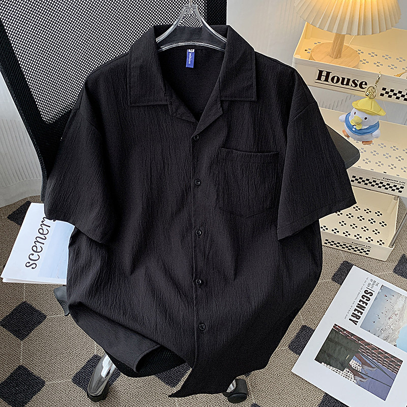 潮流新中式冰丝褶皱短袖古巴领衬衫男士纯色夏季凉感半袖休闲衬衣