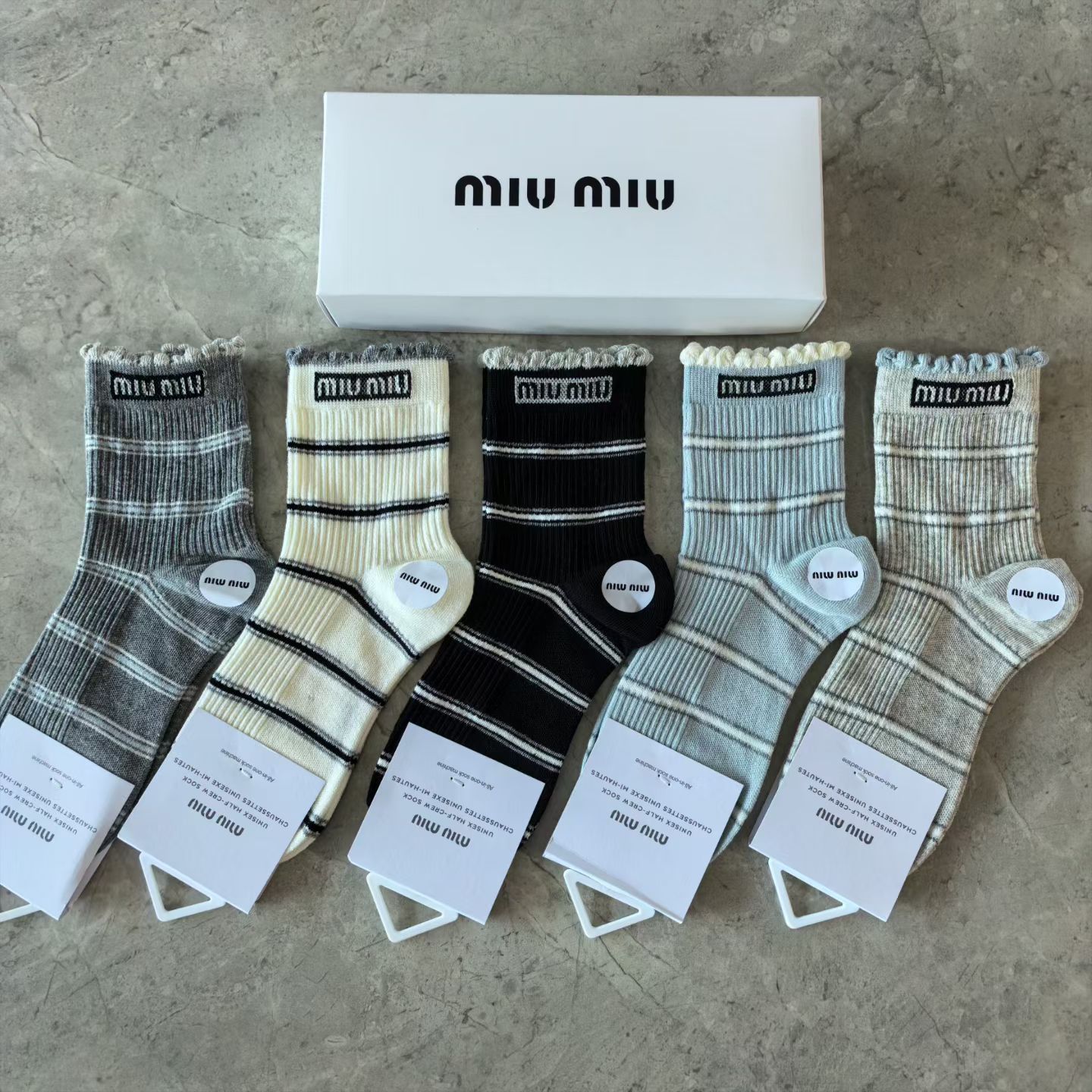 新款miumiu袜子5双盒装缪缪中筒男女袜子四季款潮牌字母袜子批发