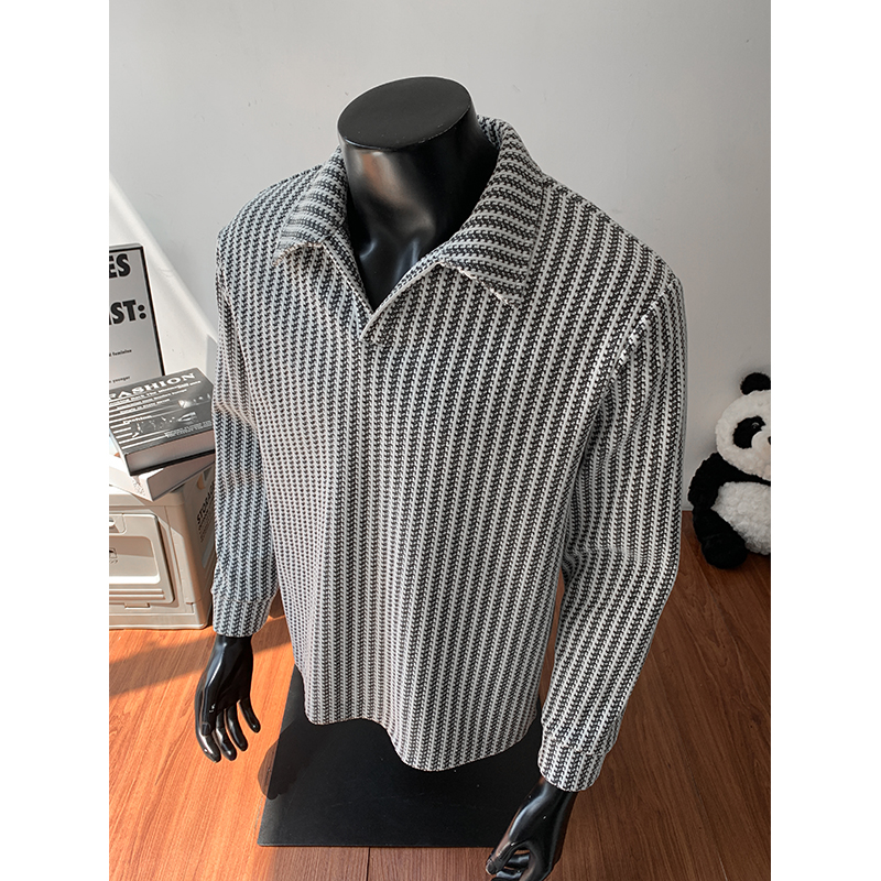 鱼骨纹美式重磅polo领卫衣男秋季条纹长袖t恤小香风打底内搭上衣