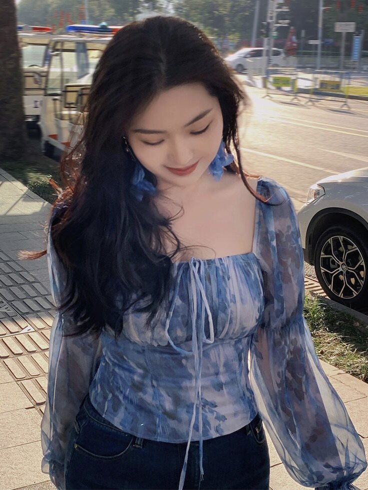 大码微胖mm早秋方领碎花长袖小衫收腰遮肚子显瘦短款上衣女新款