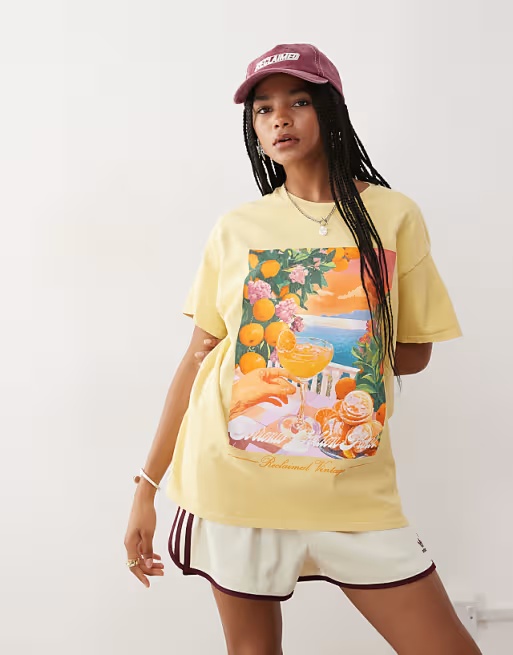 美式覆古vintage夏日海边度假橙汁印花欧美辣妹宽松黄色短袖t恤女